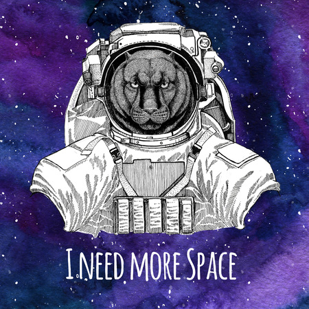 星と星雲水彩銀河背景ギャラクシー領域の背景の宇宙服を身に着けている動物の宇宙飛行士パンサー プーマ クーガー野生の猫 の写真素材 画像素材 Image
